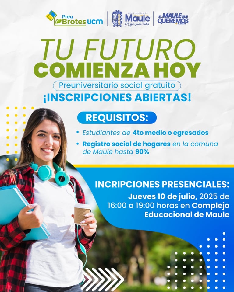 La comuna de Maule cuenta con un preuniversitario social y comunitario gratuito llamado Brotes UCM, resultado de una colaboración entre la Municipalidad de Maule y la Universidad Católica del Maule (UCM). Este programa está dirigido a estudiantes de cuarto medio y egresados para prepararlos para la educación superior. Ofrece clases presenciales, material de estudio y acompañamiento académico para nivelar la cancha y generar más oportunidades para los jóvenes de la comuna.